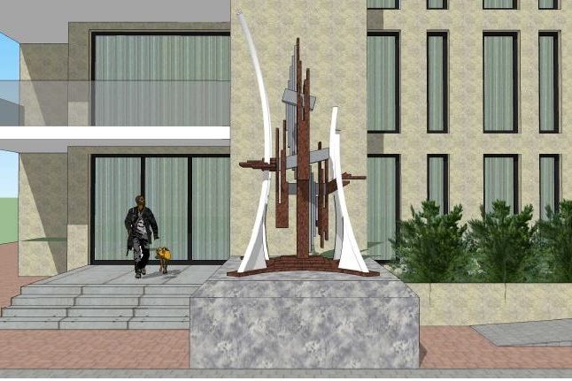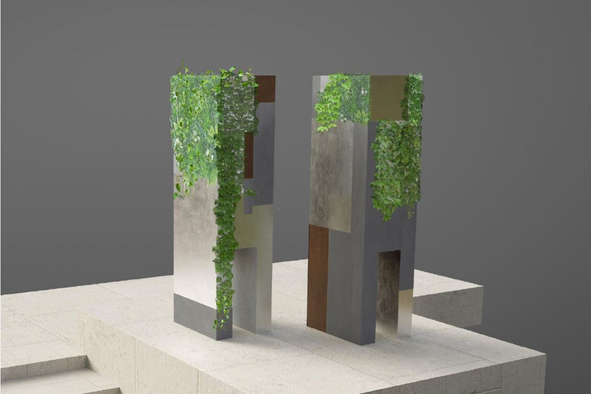 treillis cylindrique en briques Brusselse Klampsteen réutilisées. Le résultat est un ensemble sculptural perméable à l’œil dont le jeu des lumières, des ombres, des matières et des formes rendra la mémoire et l’identité de la commune toujours présentes.